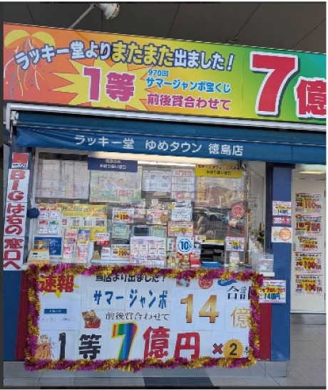 | 取扱商品 | 宝くじ(ジャンボ・通常・インスタント・スクラッチ)/ サッカーくじ(TOTO・BIG各種)/数字選択式くじ(ナンバーズ・ミニロト・ロト6) |